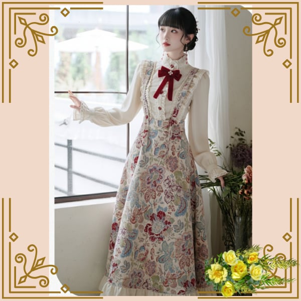 ♦レトロガーリー花柄ジャンパースカート&フリルブラウスセット/お嬢さま風コーデ♦trnd038