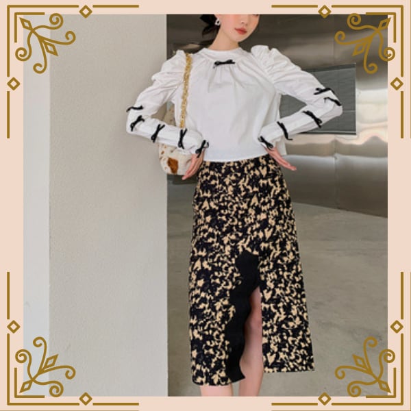 肩の膨らみと袖にリボンがマークされたデザインのトップス♡